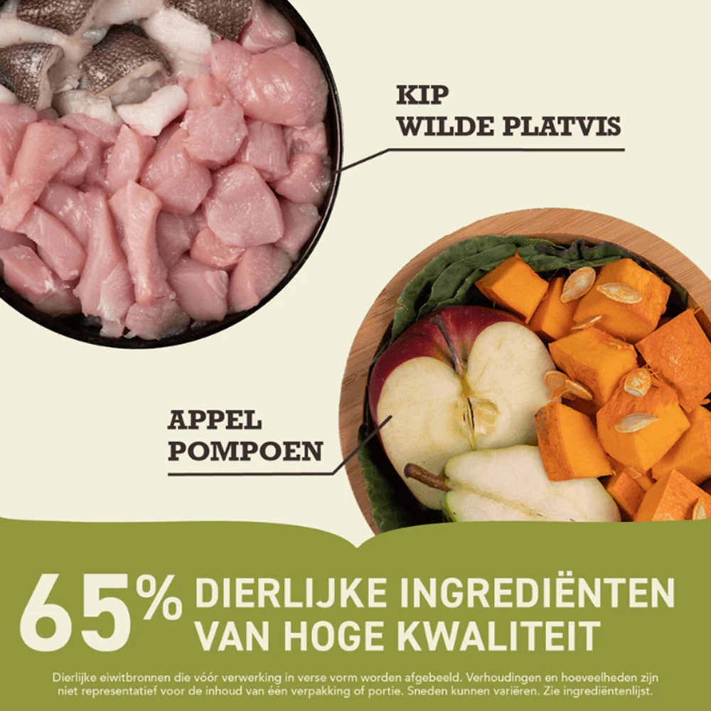 Verse gefileerde kip (16%), gedroogd kippenvlees (15%), gedroogd kalkoenvlees (14%), rode linzen, hele groene erwten, vers kippen orgaanvlees (lever, hart en nier)(4%), gedroogde haring (4%), erwtenvezels, verse hele eieren (4%), verse gefileerde platvis (3%), haring olie (1%), zongedroogde alfalfa, veldbonen, groene linzen, hele gele erwten, kippenvet (1%), vers kippenkraakbeen (1%), gedroogd bruin zeewier, verse hele pompoen, verse hele muskaat pompoen, verse hele pastinaak, verse boerenkool, verse spinazie, verse mosterdplant blad, verse raapstelen, verse hele wortelen, verse Red Delicious appels, verse Barlett peren, gevriesdroogde kippenlever, gevriesdroogde kalkoenlever, verse hele veenbessen, verse hele blauwe bessen, cichoreiwortel, kurkuma, mariadistel, kliswortel, lavendel, heemstwortel en rozenbottels. Toevoegingen: zink.