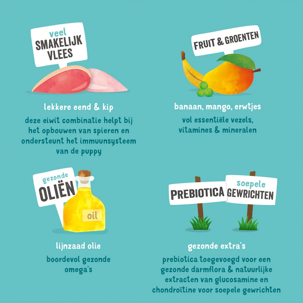Puppy – Eend & Kip is speciaal samengesteld en compleet natvoer voor puppy’s en jonge honden. De natvoeding bevat overheerlijke stukjes eend en kip. Het vlees is niet bewerkt, overgaar of gedroogd; dat maakt het verteringsproces gemakkelijker voor uw jonge pup. Het graanvrije recept is aangevuld met gezonde groente, fruit en kruiden.