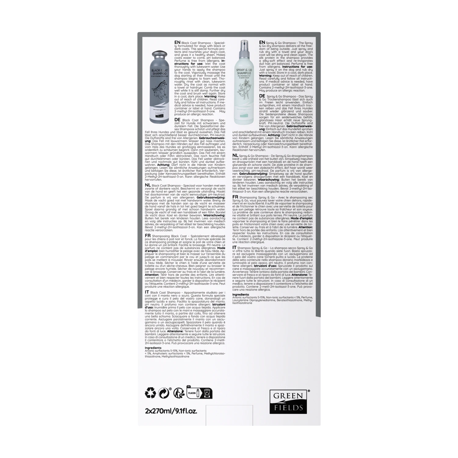Wat doet u om de vacht van uw zwarte of donker gekleurde hond mooi te houden? Met de Labrador Care Set van Greenfields wordt het een eitje! Deze verzorgingsset bestaat uit een shampoo voor de donkere vacht en een handige droogshampoo voor onderweg. De Greenfields Black Coat Shampoo bevat ingrediënten die de natuurlijke donkere kleur van de vacht versterken. Daarnaast draagt het bij aan een glanzende, gezonde en zachte vacht. De Greenfields Spray & Go is een droogshampoo ter ondersteuning van een frisse, schone vacht. Omdat er geen water voor benodigd is, is dit product perfect voor onderweg!
