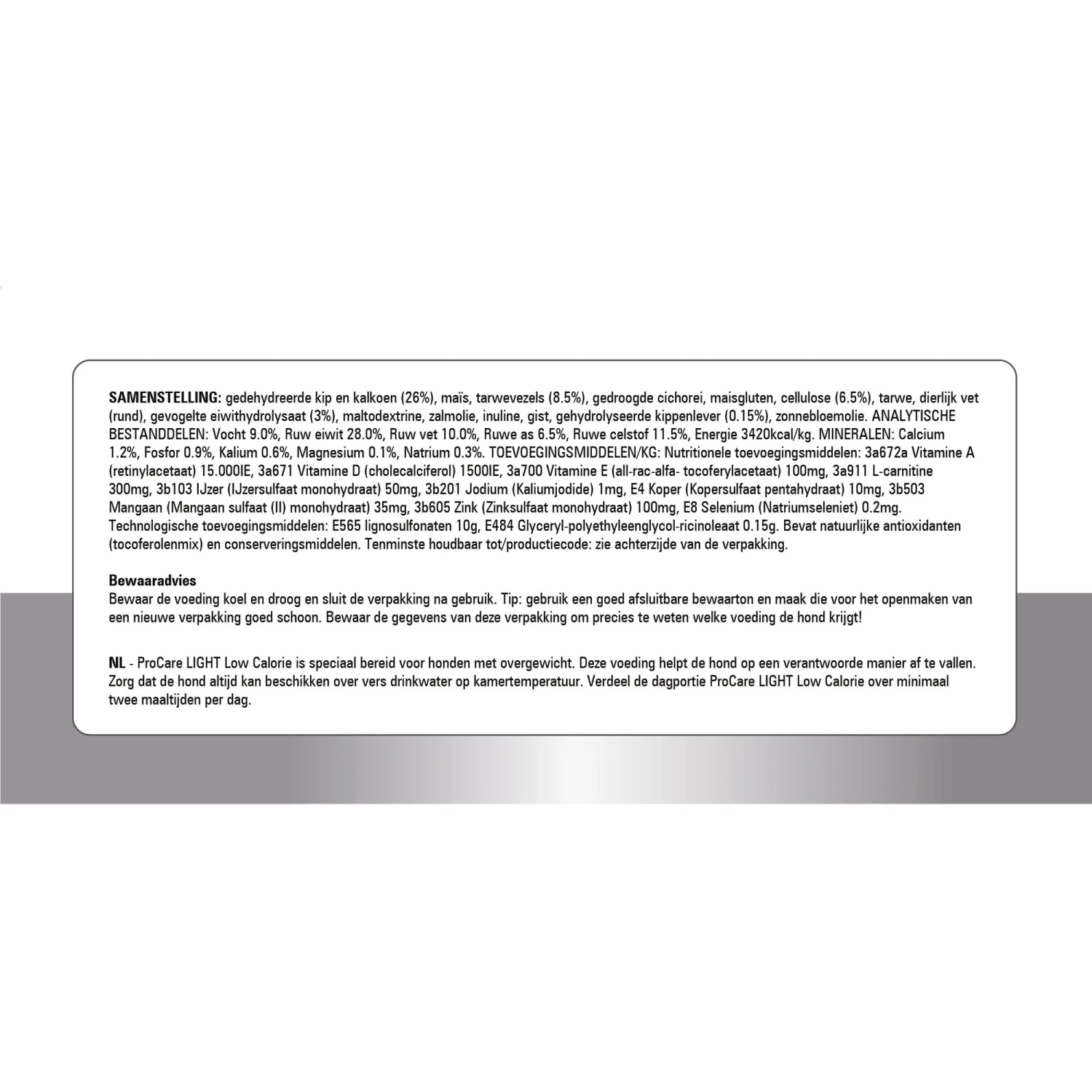 Is uw hond (iets) te dik? Dan kan de ProCare Light Low Calorie van Prins een geschikte voeding zijn voor volwassen honden met overgewicht. De geperste brokken bevatten een laag vetgehalte en extra voedingsvezels, die bijdragen aan het verantwoord afvallen. De stof L-carnitine draagt bij aan het stimuleren van de vetstofwisseling. De extra voedingsvezels in het voer ondersteunen een verzadigd gevoel. De balans aan voedingselementen dragen bij aan een optimale conditie tijdens het afvallen. De eiwitten van kip en kalkoen ondersteunen de groei, instandhouding en de conditie van de spieren.