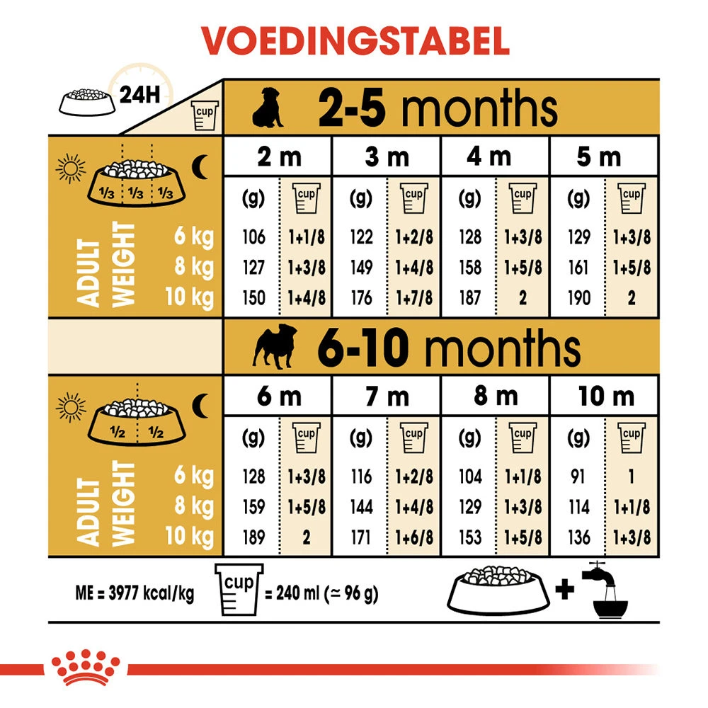 Laat uw pup van het ras Pug opgroeien tot een gezonde hond met de Pug Puppy van Royal Canin. Mopshonden kenmerken zich als volgzame, vrolijke en trouwe hondjes. Het zijn leuk gezelschapshondje en houden van aandacht. Toch kent deze Mopshond wat aandachtspunten, zoals de ademhaling en het behouden van een gezond gewicht. De Pug Puppy van Royal Canin draagt bij aan het gezond laten opgroeien van uw pup.